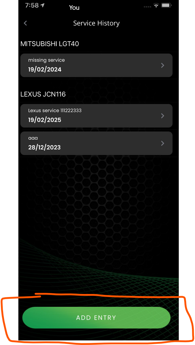 2) Here you will find all the service history under each vehicle listed. Hit 'add entry' to enter a new service note.