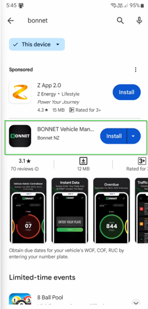 4. In the search results, make sure not to click on any ads and find the listing 'BONNET Vehicle Management App', then click on it.